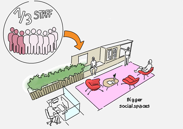 Izmene koje Weston Williamson + Partners namerava da napravi uključuju postavljanje zone za čišćenje u okviru lobija, postavljanje providnih barijera oko svakog stola i prilagođavanje vrata kako bi se omogućilo otvaranje bez dodirivanja kvake. Zatim, da se sastanci održavaju na otvorenom, kao i da se zaposle barista i kuvar, da zaposleni ne ulaze sami u zajedničku kuhinju.