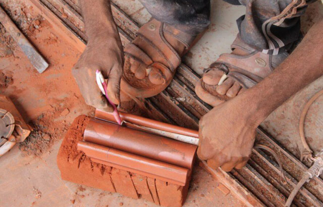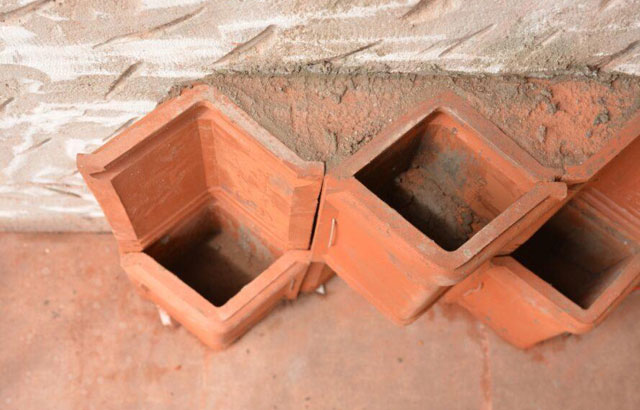 Proizvedeni od lokalnih majstora, glineni crepovi u obliku slova V su modifikovani uz dodatak malih žlebova kako bi se spojili. Crepovi se uz pomoć cementa pričvršćeni ručno za zid i raspoređeni po cik-cak obrascu. "Džepovi" stvoreni od dva crepa u obliku slova V postavljeni jedan preko drugog korišćeni su za držanje biljaka i svetiljki ali se mogu zatvoriti i biti u formi police na koju se mogu postaviti različite vrste predmeta.