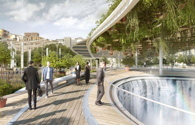 Preko mosta bi se prostirala velika uređena nadstrešnica koja bi pružila hlad i mesto hiljadama visećih biljaka u saksijima. Prostor za odmor i sedenje nalazio bi se uz stazu kako bi podstakao ljude da ovde dođu na ručak. Mobilijar bi bio postavljen i dostupan u nivou ulice i ispod nadstrešnice.