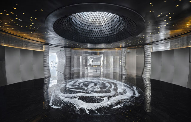 Ulaz vodi ka središnjem betonskom jezgru zgrade u kojem se nalazi mračno predvorje u koje svetlost dopire kroz krovne prozore. U ovom prostoru dominiraju detalji od nerđajućeg čelika i "vodeni zidovi-zavese" koji skrivaju stepenice i lift. Na spratu iznad nalaze se kupatilo i soba za sastanke, dok se na drugom spratu nalaze glavni galerijski prostori povezani sa terasama, biblioteka i bar. Ovaj sprat je veoma živopisno dekorisan: plafoni su ukrašeni, podovi su posebno ispolirani, nameštaj je neobičnog dizajna sa zakrivljenjima, dok su skulpture nalik na mehuriće da podsećaju na vodu u različitim stanjima.