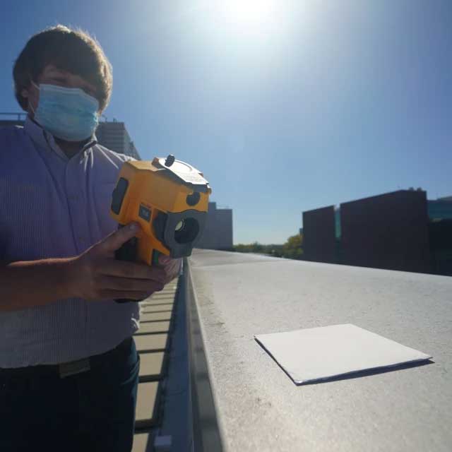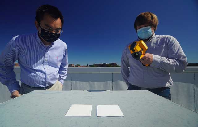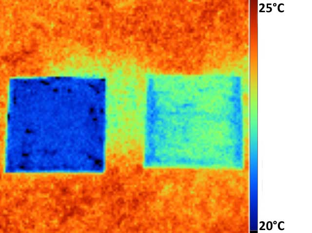 Tim je testirao novu boju na otvorenom tokom dva dana i pokazao je da je premazana površina izložena direktnoj sunčevoj svetlosti ostala za 1.7°C hladnija od temperature okoline, pokazujući snagu hlađenja od 37W/m². Noću je čak temperatura boje pala na 10°C ispod temperature okoline. U drugom testiranju su istraživači neke delove uzorka obojili novom bojom, a druge uobičajenom belom bojom iste debljine. Pomoću infracrvene kamere mogla je jasno da se vidi razlika u temperaturi između dva materijala (slika ispod).