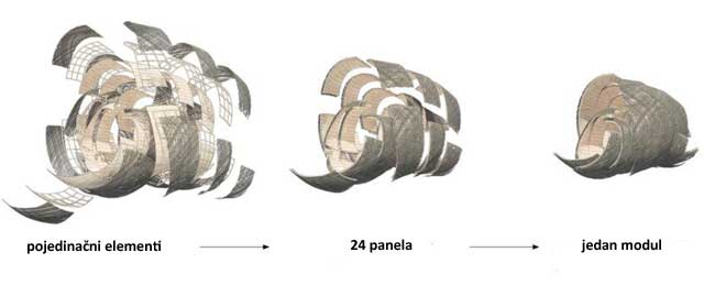 Moduli se spajaju uz pomoć pojedinačnih delova, a ne kao celina što proizvodnju čini vrlo prilagodljivom. Paneli se mogu izraditi u zavisnosti od želja i potreba. Pojedinačni elementi su malih dimenzija pa se mogu preraditi u lokalnim fabrikama, brzo transportirati do gradilišta i lako montirati. Nakon toga, module je moguće lako rastaviti i premestiti na druge lokacije. Moduli kućice na drvetu sastoje se od 24 pojedinačna panela s drvenim okvirom koji uključuje unutrašnju savijenu drvenu oblogu i spoljnu izrađenu od kore drveta lijane sa tog mesta.