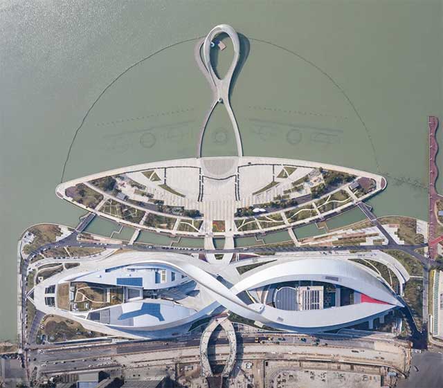 Moderna forma ovog kulturnog centra daje atraktivan izgled priobalju jezera stvarajući novi krajolik koji povezuje vodu, nebo i arhitekturu kroz igru odsjaja u duginim bojama. Metalna traka izrađena od čelika i aluminijuma proteže se na dužini od 500 metara i daje notu povezanosti, zagonetnosti i savremenosti. Kako je arhitekta De Portzamparc pojasnio, "krila" povezana trakom u formi osmice predstavljaju dualnost u kretanju - jin i jang.