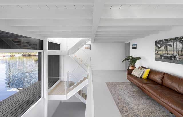 U suterenu su dve jednokrevetne spavaće sobe, zajedničko kupatilo, vešeraj i otvoreni dnevni boravak, koji može poslužiti i kao radna soba. Stakleni prozori od poda do plafona koji se nalaze na poluspratnom delu, dnevnom boravku obezbeđuju pogled na vodu i prirodno osvetljenje. Spavaće sobe takođe imaju stakleni zid i vrata, kako bi i ovde dospela sunčeva svetlost i izbegao osećaj zatvorenosti. Drugi sprat sadrži glavnu spavaću sobu, kupatilo i dodatni dnevni boravak, dok treći nivo ima otvoreni prostor sa velikom modernom kuhinjom, trpezarijom i izlazom na veliku otvorenu terasu.