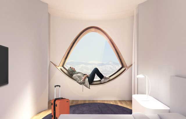 U prizemlju zgrade su postavljeni 9m visoki prozori sa lukovima kako bi uokvirili ulaze i poglede u predvorje, restoran i prostore za ručavanje. Iznad su prozori koji prate "ritam" donjeg baznog dela i stapaju se u dinamičnu celinu dajući fasadi skulpturalni izgled. Svaki otvor je širine hotelske sobe, a veličina prozora se menja u zavisnosti od toga da li je u pitanju javni ili privatni prostor. Prepoznatljivi oblici prozora biće po naliku na šablone pronađene na drveću aspen. Kako drveće raste, ono odbacuje donje grane i ostavlja za sobom tamne tragove u obliku "oka" na kori stabla, pa če tako na zgradi prozori biti te "oči".