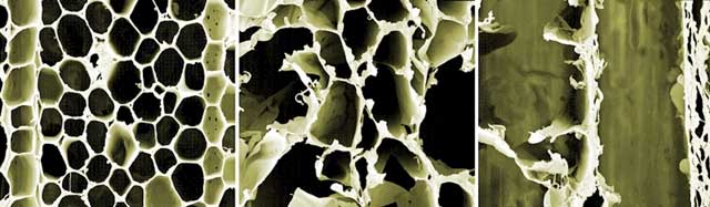 Drvo pod mikroskopom pre tretmana (levo) i nako izvlačenaja lignina (sredina i desno) (Foto: ACS Nano / Empa)