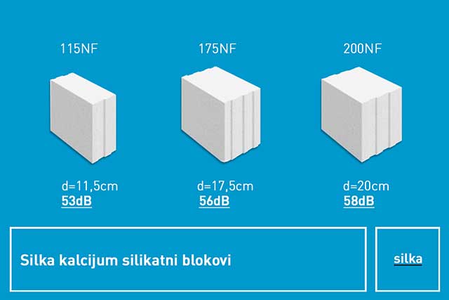Reč je o Silka kalcijum silikatnim blokovima, koji se izrađuju u različitim dimenzijama (200NF, 175NF i 115NF) i nalaze primenu kod različitih tipova objekata na svim pozicijama, na kojima postoje povećani zahtevi za zvučnom izolacijom. Kombinacijom Silka blokova sa oblogama, postiže se čak neverovatnih 70 dB, i to sa veoma malom debljinom blokova od svega 22.5cm.