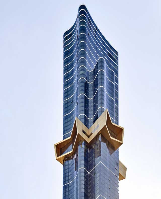 Kula koja se proteže na 100 spratova uključuje lobi u prizmenom delu, parking prostor na spratovima iznad i ukupno 1.105 stanova. Stambene jedinice se kreću od jednosobnih do prostranih apartmana na više nivoa i penthausa. Enterijer je opremljen nameštajem od pliša i korišćeni su luksuzni materijali za ostale elemente. U okviru objekta se nalaze i sadržaji poput dva "beskonačna" bazena, salona, prostora za sastanke, mesta za ručavanje, pozorišta, dve teretane i vertiklanog "nebeskog" vrta. Cena je prava sitnica, pa za one skromnije kvadrature treba izdvojiti od 470.000 AUD, dok veći apartman na 97. spratu košta preko 5,5 miliona AUD.