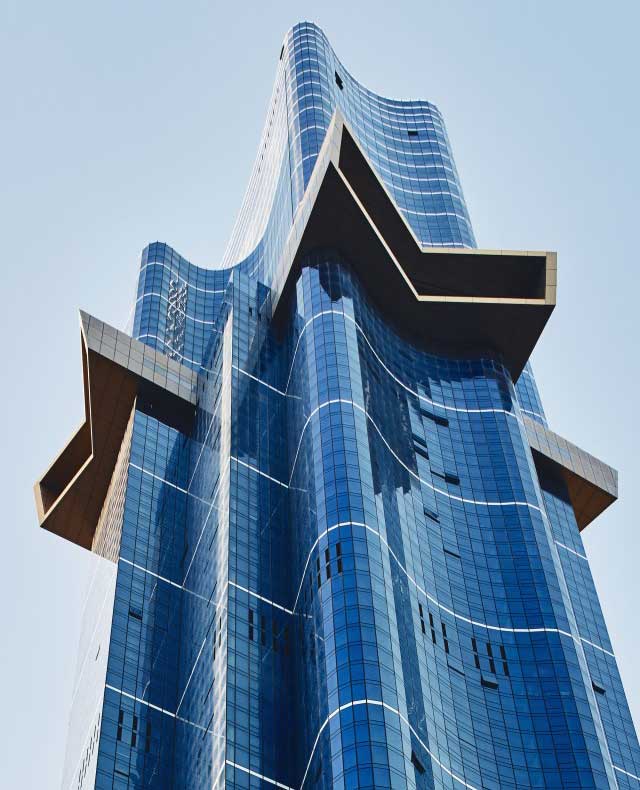 Fasada se sastoji od 14.854 staklenih ploča i po njoj se mogu primetiti bele "trakice" koje je osvetljavaju noću pa izgleda kao da je prošarana vijugavim linijama. Skulpturalni oblici, otvoreni danju, upadljivi su noću, a vodoravne trakice osvetljene. Podešeni su da formiraju šablone i prate "Starbust" koji se noću pojavljuje kao užarena zvezda. Zvezda zlatne boje koja je ugrađena i čini deo fasade sastoji se iz 24 montažne rešetke. Zadržana je i postojeća fasada u prizemlju koja ima istorisjku vrednost. Na deset spratova iznad nalazi se parking za automobile koji je prekriven palmama i drvećem. Zelenilo je zasađeno i sa spoljnje strane prizemnih spratova.