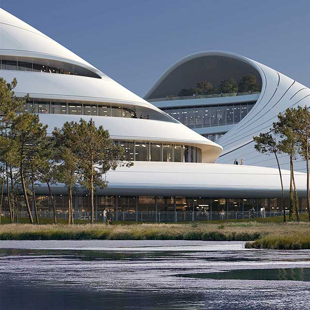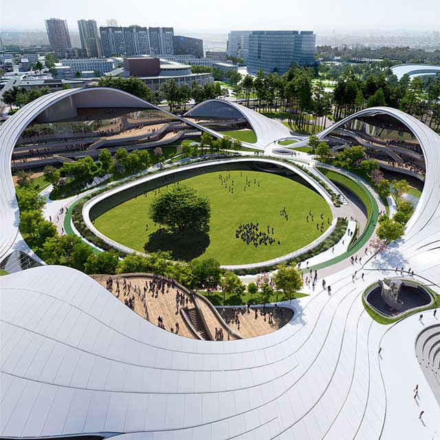 Ono što izdvaja ovaj poduhvat jeste forma krova koja linijama odražava mekoću i gracioznost drevnih kanalskih gradova poredanih na južnim obalama reke Jangce u istočnoj Kini, pa deluje kao da pluta formirajući neprekidni horizont, poput cerade koju njiše vetar. Kružni travnjak koji se nalazi u sredini zamišljen je da bude javni park u kojem se ljudi mogu okupljati, opustiti i družiti. Ovde se mogu organizovati i različite vrste događaja.