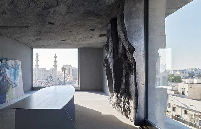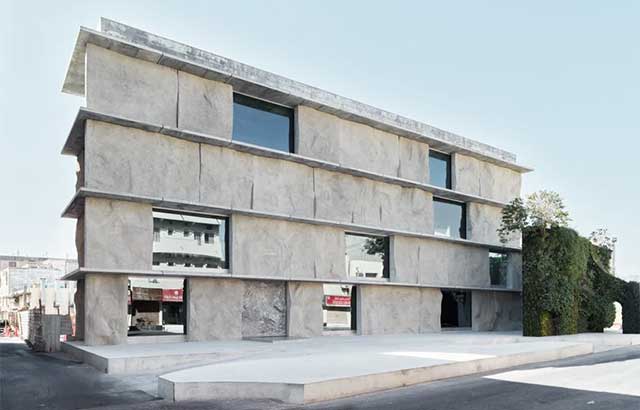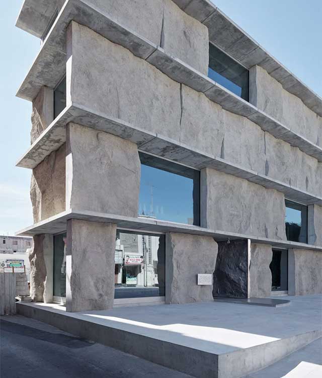 Fasada koja je sama po sebi glavni prostorni element sastoji se iz niza betonskih oblika dobijenih izlivanjem u kalupe sa peskom. Dobijeni elementi nalik su jedinstvenim "stenama" stvorenim prirodnim putem. Unutar objekta se takođe nalaze elementi od betona u vidu podnih ploča, dok su velike roletne i ulazna vrata izrađeni od aluminijuma takođe izlivenog u pesku.