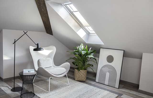 U prostorima u kojima se uglavnom provodi vreme čitajući ili odmarajući, potrebna je fleksibilna kontrola svetla. Dostupne u providnoj varijanti i varijanti za zamračenje, VELUX plisirane roletne imaju i prednost fleksibilnog upravljanja, jer se mogu kontrolisati sa gornje i donje strane i postaviti bilo gde u prozoru. Savršeno rešenje za ovu sobu bila je plisirana roletna u boji peska, koja pruža nežno zamračenje prostora.