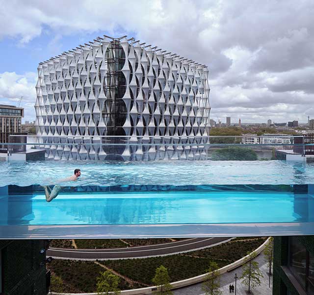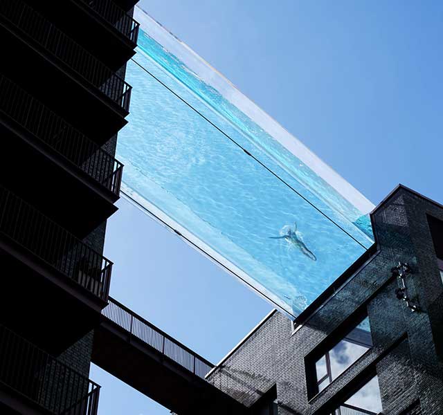 "Sky pool" nalazi se između desetih spratova dva stambena bloka koja su nedavno završena uz američku ambasadu u Battersiju. Blokovi su deo imanja Embassy Gardens. Bazen zajedno sa spa centrom, teretanom, privatnim bioskopom, zatvorenim bazenom i co-working prostorima dostupan je stanovnicima zgrade Embassy Gardens koji plaćaju više naknade za ove dodatne usluge.