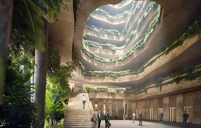 Unutar zgrade nalaziće se poslovni prostor - kancelarije sobe za sastanke i sale za konfrencije, ali i dvorana i restoran na nižim spratovima koji će biti raspoređeni oko centralnog atrijuma. Centalna parznina prostiraće se podnožja do krova kako bi omogućila ulazak svetlosti. Atrijum će biti ispunjen zelenilom - u podnožju će biti drvenastih i žbunastih biljaka dok će na svakom spratu biti posađene one nižeg rasta koje se lepo uklapaju "spuštajući se" niz zidove. Na svakom spratu će se nalaziti različite biljne vrste koje će doprineti boljem vazduhu unutar prostora. Zelenilo sa spoljašnje strane činiće unutrašnjost zgrade hladnijom i omogućiti da se manje koriste klima uređaji. Maksimiziranje dnevne svetlosti i prirodno ventilisanje biće zagarantovani na ovaj način.