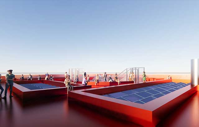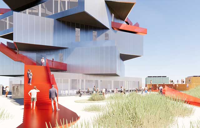 "Kutije" su zastakljene i tako raspoređene da obezbeđuju pogled ka obližnjem Severnom moru i peščanim dinama. U okviru pet ovih volumena nalaziće se sadržaji za posetioce, poput kafića, restorana i izložbenog prostora, dok će se u središtu nalaziti atrijum sa skulpturom i modelom luke Roterdam. Kada se posmatra iz daljine deluje kao da se oko ovih formi uvija crvena traka. U pitanju su stepenice koje iz podnožja vode do krovne terase.