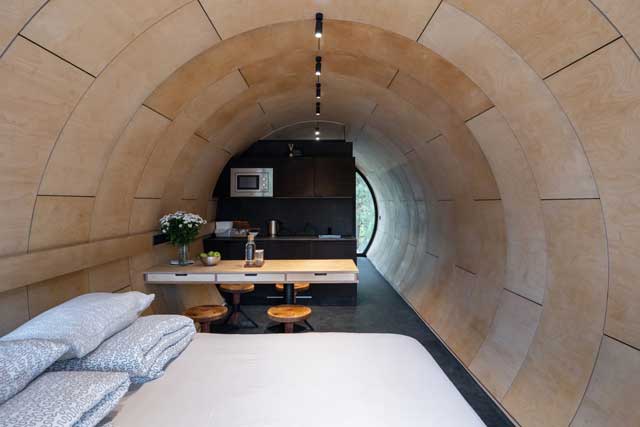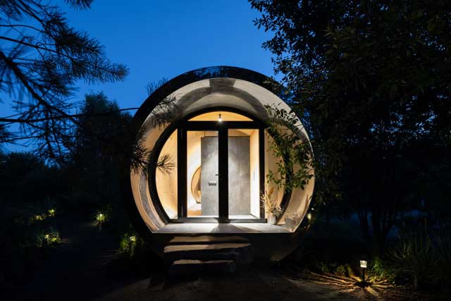 Cevasta forma sa reflektujućom fasadom okružena zelenilom postavljena na brdu najnoviji je primer objekta za privremeni smeštaj u prirodi. Refleksiju daje obloga od nerđajućeg čelika. Originalna ideja sprovedena je u realnosti i predstavlja praktičnu i kompaktnu "kućicu" za odmor i relaksaciju. Izgledom asocira na omot albuma "Tubular Bells" Majka Oldfilda. Svakako zapanjujuće arhitektonsko delo koje spaja modernu umetnost i nove tehnologije sa "atmosferom" udobnog doma.