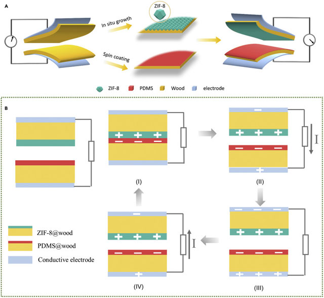 Jedan drveni panel impregniran je silicijumom, zauzima elektrone kada dođe u kontakt sa predmetom. Drugi panel je infuziran nanokristalima zeolitskog imidazolatnog okvira-8 (ZIF-8), kompleksa koji sadrži jone metala i organske molekule i koji ima tendenciju da gubi elektrone. Istraživači su ovu tehniku impregnacije nazvali "funkcionalizacija".