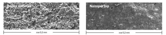 Sa leve strane je struktuirana površina običnog maltera koja stvara uslove za taloženje prašine kojom se hrane mnogi mikroorganizmi, dok je sa desne strane mikroskopski glatka površina koja štiti fasadu od nečistoće i prvi je preduslov održavanja čistog izgleda