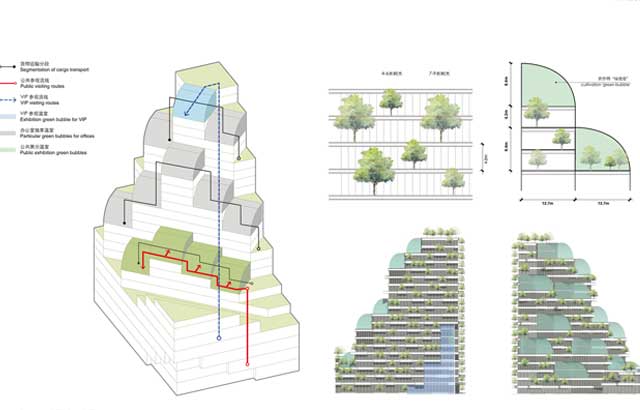 Da bi se osigurao pravilan rast vegetacije, projektovano je 12 staklenika na terasama zbog okruženja u Šangaju i sezonskih vremenskih varijacija. Za izgradnju staklenika koristiće se membranski materijal ETFE, koji je lagan, elastičan, transparentan i potpuno se može reciklirati. Drveće manjeg rasta zasađeno je na severnoj strani konstrukcije radi dodatne sigurnosti i privatnostii, stvarajući pritom klasičnu vertikalnu šumu.
