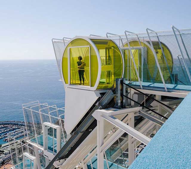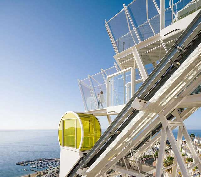 Žičara je u formi metalne konstrukcije sa trouglastim elementima i platformama nalik terasama do kojih su naslagane staze za pristup na šest različitih nivoa. Terase su obavijene žičanom mrežom dok je na dnu postavljena plava podna obloga. Kabine su napravljene od zakrivljenog i ravnog žutog stakla koje je u dva različita stepena transparentnosti. Ove prozirne kabine jarke boje ističu se među belim okolnim fasadama.