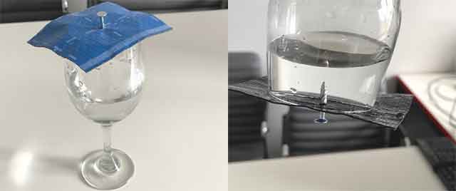 Eksperiment: Krovna folija je stavljena na čašu, a zatim je probušena ekserom. Čak ni nakon okretanja čaše naopako, voda nije curila.