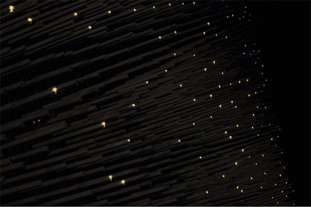 Aluminijumski delovi koji čine spoljašnjost napravljeni su u fabrici, a zatim transportovani kamionima na gradilište i pažljivo pričvršćeni skrivenim šrafovima. Komadi nisu iste teksture, boje i dužine, a većina ima integrisano noćno LED osvetljenje. Pored toga što je vizuelno upečatljiva, metalna fasada zapravo pomaže u zatamnjivanju unutrašnjosti, kažu u firmi.