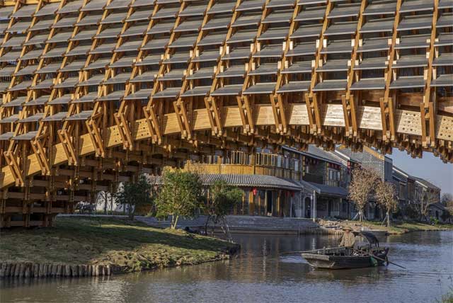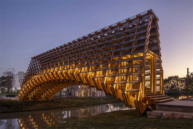 Nedavno je završen neobičan drveni most u Gulou Waterfront odmaralištu u gradu Jiangmen inspirisan tradicionalnim dizajnom kineskih mostova. Uz dodate moderne detalje, ovaj natkriveni prelaz služi i kao vidikovac u ruralnoj Kini.