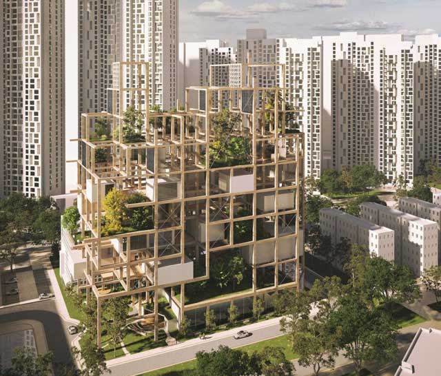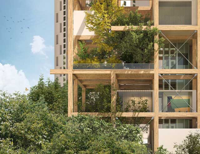 Za samu konstrukciju korišćeno je unakrsno lamelirano drvo. Sistemi za korišćenje izvora obnovljive energij kao što su solarni paneli i vetroturbine nalaze se na vrhu zgrade, a tu su i prostorije za prikupljanje i ponovnu upotrebu vode.