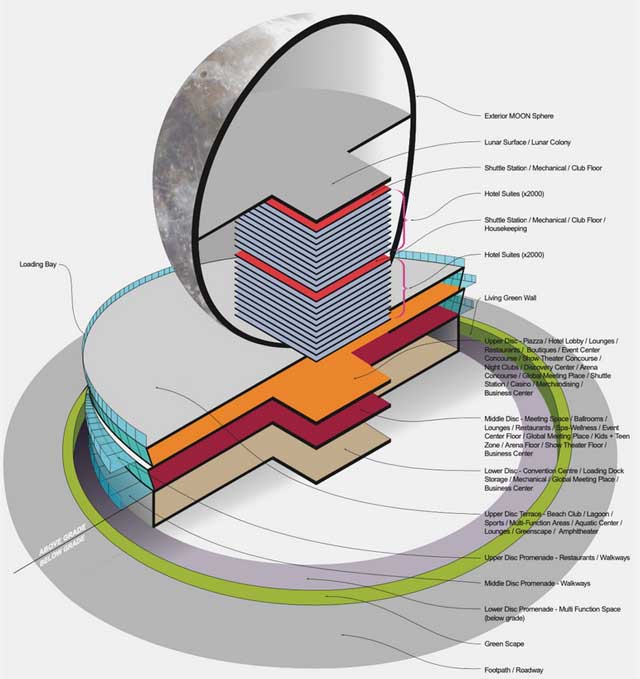 Hotel od 20 spratova nalazio bi se unutar sfere i omogućavao bi lunarno iskustvo koje bi oponašalo površinu Meseca i uključivalo "lunarnu koloniju".
