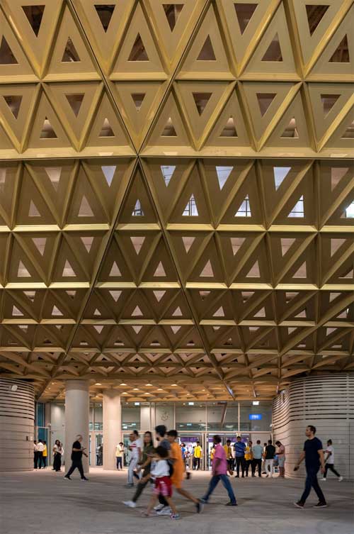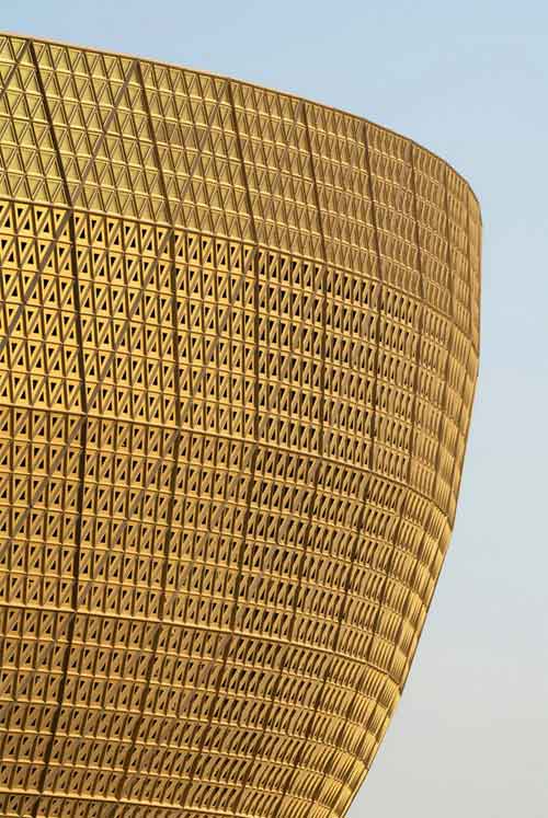 Autori opisuju stadion kao zlatni sud, a na njegovu formu uticale su islamske kugle kao i lokalna arhitektura. Perforirana fasada koja propušta svetlost unutar stadiona sastavljena je od brojnih ravnih, trouglastih komada oslonjenih na čelični okvir kako bi se stvorila zakrivljena forma.