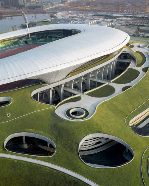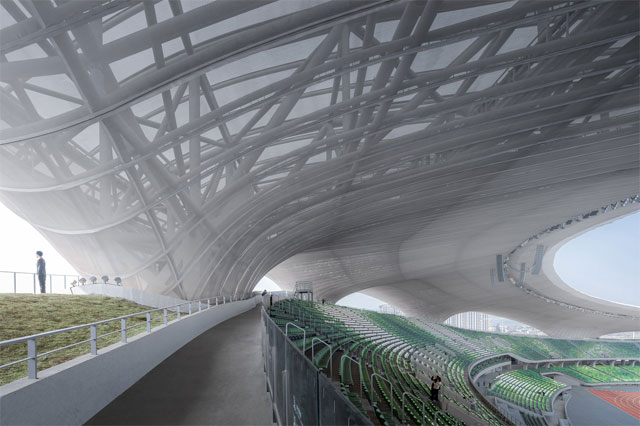 U kineskom gradu Quzhou izgrađen je vijugavi betonski stadion ugrađen u zemlju i prekriven travnatim krovom. Autor ove neobične građevine je poznati studio MAD Architects.