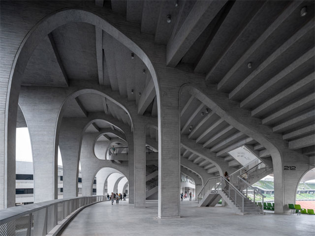Stadion ima nagnutu fasadu sa devet ulaza i oslonjen je na 60 stubova napravljenih od betona domaće proizvodnje.