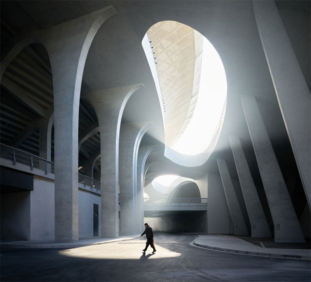 MAD je dizajnirao ulaze u zgradu sa dvostruko zakrivljenim površinama koje podsećaju na talase, dok su zidovi napravljeni od betonskih ploča sa teksturom nalik drvetu.