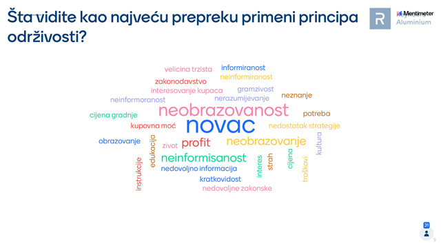 Organizovan je tako da su naše kolege aktivno učestvovale u debati koristeći aplikaciju Mentimeter koja je zbrajala glasove i odgovore na postavljena pitanja. Sva pitanja su bila vezana za održivost, njenu implementaciju i primenu u projektima i realnom životu.