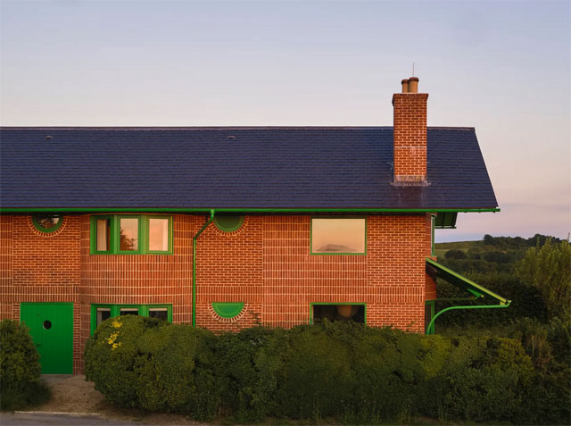 Crpeći inspiraciju za dizajn iz pokreta umetnosti i zanata, kuća ima velike nadstrešnice, a smela zelena boja oživljava je čineći kontrast crvenoj cigli. Imajući na umu klimatske promene, njeni debeli, dobro izolovani zidovi i veliki prepusti imaju za cilj da je zaštite od nepogoda i smanje dobijanje sunčeve toplote, posebno tokom letnjih meseci. Pored toga, krov od škriljaca predstavlja dom za lokalnu populaciju slepih miševa. Druga mesta za gnežđenje takođe su suptilno ugrađena u zidove.
