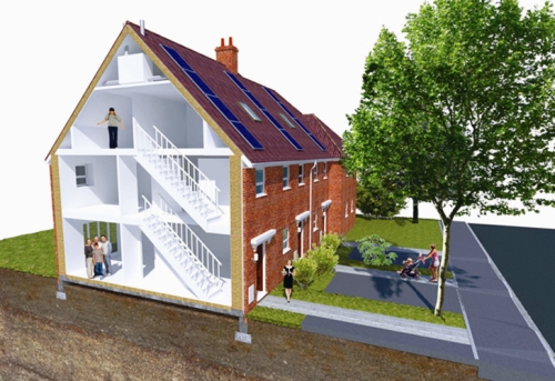 Kuće su izgrađene od prefabrikovanih drvenih ramova i drvenih panela punjenih slamom, a svaka kuća je onda obložen sa ciglom kako bi se održala tradicionalna estetika ove oblasti. Bale slame pružaju odlične nivoe izolovanosti za koje Univerzitet u Batu veruje da će smanjiti troškove energije za i do 90 odsto za svaku kuću pojedinačno.