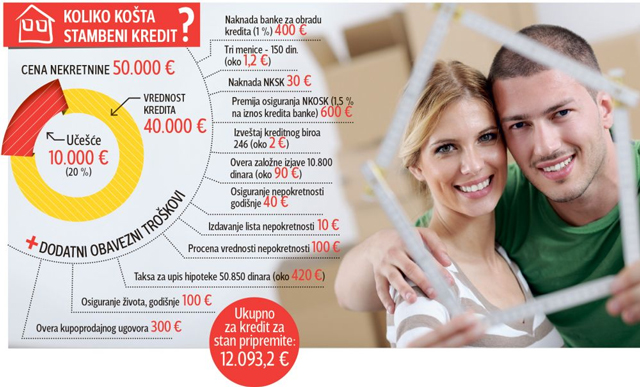 Učešće je 20 odsto, sve ostalo su takse i naknade. Najveće stavke su naknade za obradu kredita koje banke naplaćuju po stopi od 0,5 do jedan odsto vrednosti pozajmice. Za kredit od 40.000 evra ta naknada iznosi 400 evra. Dalje na red dolazi „Nacionalna korporacija za osiguranje stambenih kredita“ (NKOSK), koja svoju uslugu naplaćuje ukupno 630 evra. U zbiru notarima za overu kupoprodajnog ugovora i založnog prava treba da se plati 390 evra.