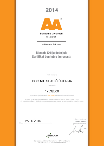 Kompanija NIP SPASIĆ d.o.o. Ćuprija, zadovoljila je kriterijume i po drugi put se našla u grupi trenutno NAJUSPEŠNIJIH KOMPANIJA U SRBIJI i ove godine pripada grupi – Bonitetne izvrsnosti AA (ove godine nosi viši poslovni, tj. kreditni rejting, u odnosu na prethodnu godinu koji ukazuje na trend uspešnosti).