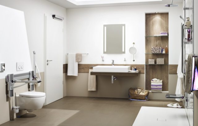 Slika 3: Kupatilu sa tušem u ravni poda i toaletom za osobe sa posebnim potrebama pripadaju i vrata koja se automatski pokreću uz pomoć motora PortaMatic koji osobama sa posebnim potrebama i osobama u kolicima olakšavaju pristup samom kupatilu.