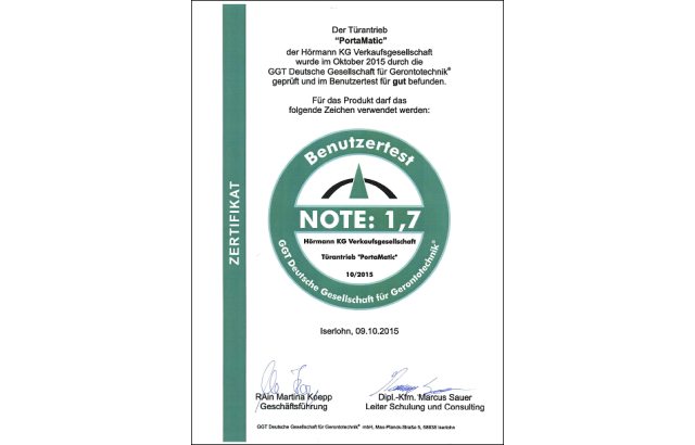 Slika 6: Hörmann-ov PortaMatic je do sada jedini motor ispitan i dobro ocenjen od strane nemačkog društva za geronto-tehniku (GGT). Vrednovanje se odnosi na očekivanja u estetici, kvalietu i komforu korisnika 50 plus.
