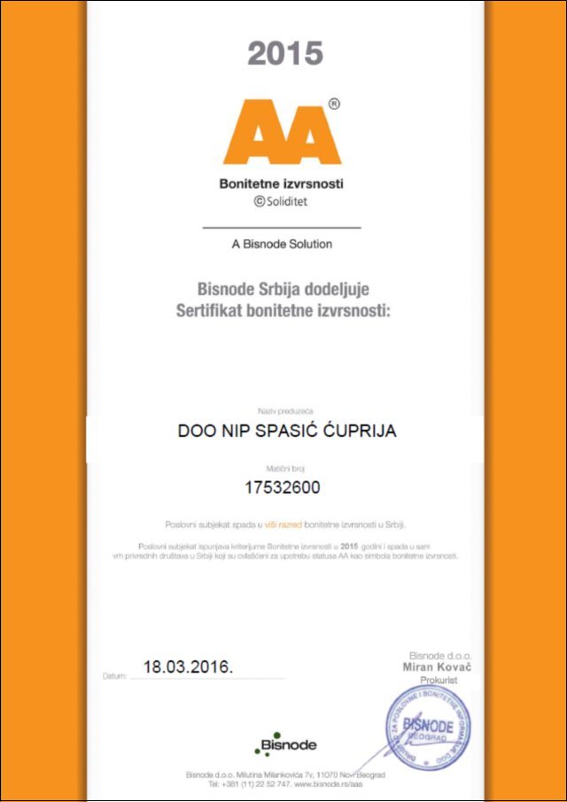 NIP SPASIĆ D.O.O. iz ĆUPRIJE je zasluženo sertifikovan treću godinu zaredom za odlično poslovanje u 2015. godini sa ocenom kreditnog rejtinga AA.