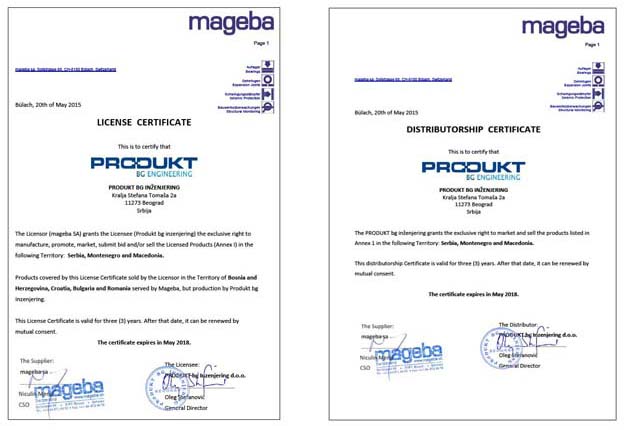 Posle proizvedenih više od 1200 dilatacionih spojnica i više od 20.000 elastomernih i 2.500 pot i sferičnih ležišta, vodeći svetski gigant u oblasti mostogradnje Mageba ukazao je poverenje kompaniji PPRODUKT BG Inženjering dodelivši joj ekskluzivno pravo da proizvodi i zastupa njihove proizvode.