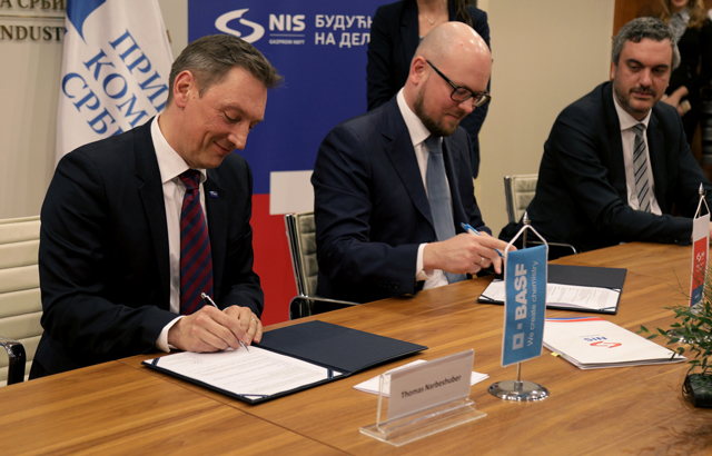 Sporazum o poslovno-tehničkoj saradnji potpisali su Kiril Tjurdenjev, prvi zamenik generalnog direktora NIS-a za preradu i promet, i dr Tomas Narbeshuber, potpredsednik kompanije BASF za Jugoistočnu Evropu.