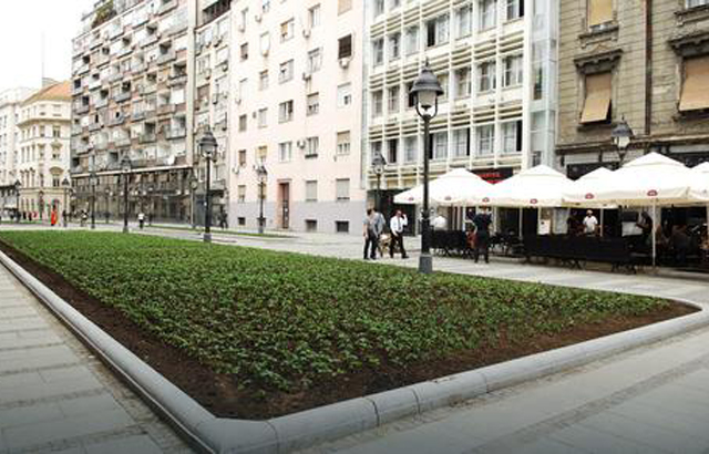 Prostor je najvećim delom popločan, a uz objekte i na mestima opterećenja postavljene su sitne kocke. Ograde drveća i korpe za otpatke oblikovani su kao i u Knez Mihailovoj ulici. Postavljen je 41 kandelaber, zelene površine čine oko 1.500 m², a 48 sadnica drveća biće postavljeno prema pravilima sadnje za ovu vrstu biljaka, tokom jeseni.