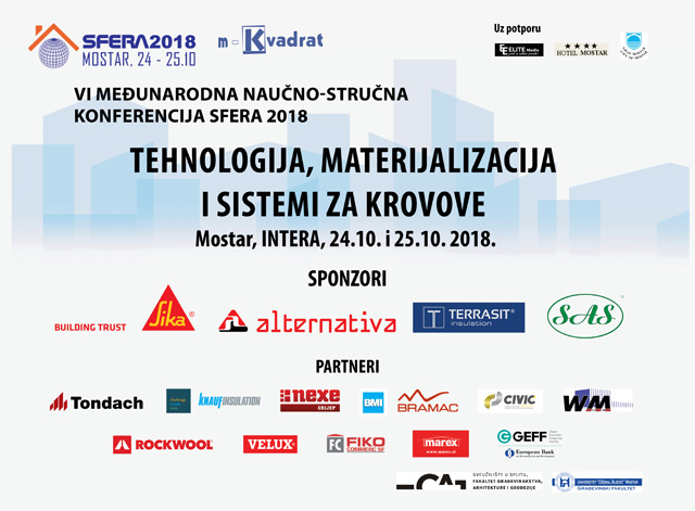 VI Međunarodna naučno stručna konferencija '„Sfera 2018: Tehnologija, materijalizacija i sistemi za krovove'' održaće se 24. i 25.10.2018. godine u Mostaru. I ove godine konferencija će ponuditi bogat program, edukativne prezentacije i predavanja, debate, diskusije i slično.