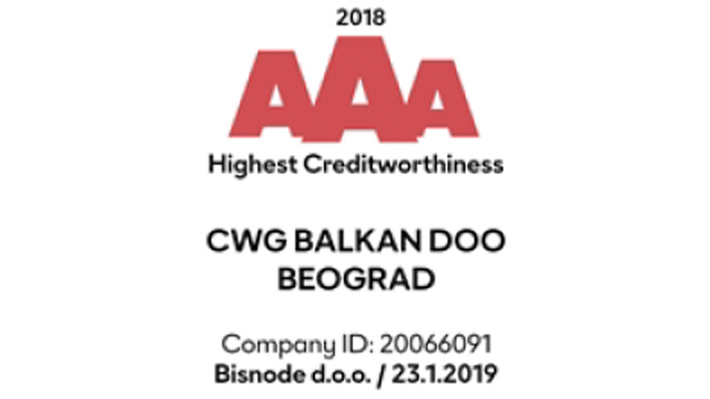 Preduzeće CWG BALKAN d.o.o. Beograd na osnovu međunarodne kategorizacije i finansijske analize tri poslovne godine (2015, 2016 i 2017), ispunjava uslove za izdavanje prestižnog međunarodnog Sertifikata bonitetne izvrsnosti najvišeg rejtinga AAA kao preduzeće među najuspešnijim u svojoj delatnosti, i svrstano je u 1,7 % najlikvidnijih preduzeća u Republici Srbiji.