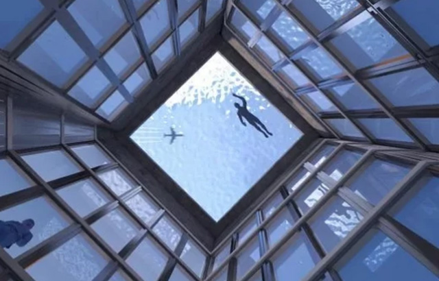 Bazen zapremine 600.000 litara, koji je projektovala kompanija Compass Pools iz Saseksa, napravljen je od providne termoplastike polimetil metakrilata, koji „prenosi svetlost na sličnim talasnim dužinama kao voda tako da voda u bazenu deluje savršeno bistro", navodi kompanija.