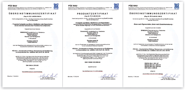 - Sertifikat za proizvod: PRODUKTZERTIFIKAT: Montažne konstrukcije od betona, armiranog betona i prednapregnutog betona - harmonizovane sa nacionalnim normama (Reg.-Nr. PZ-13.455.00-6.30)