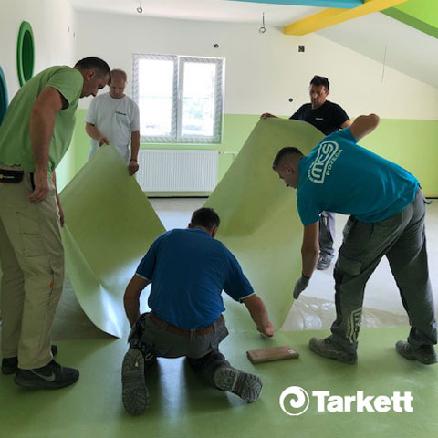Tokom akcije, tim zaposlenih u kompaniji, volonterski se uključio u poslove ugradnje donirane podne obloge, pružajući podršku profesionalnim instalaterima na postavljanju 350m² Tarkett poda.
