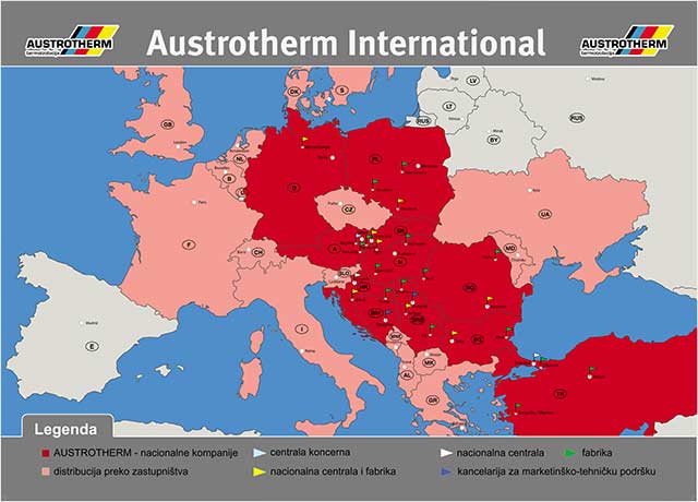 Srpsko preduzeće Austrotherm d.o.o. je tradicionalno jedno od najuspešnijih unutar grupacije Austrotherm International - sa potpunom nadležnošću i za teritorije Crne Gore i Severne Makedonije i generalno sa značajnim obimom izvoza svojih proizvoda ne samo u zemlje jugoistočne, već i u zemlje srednje Evrope.